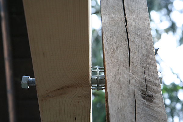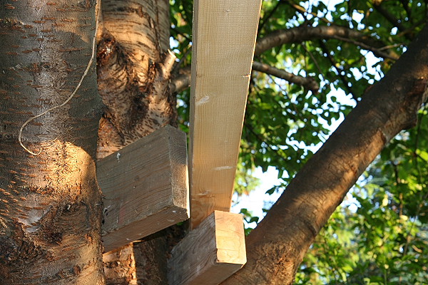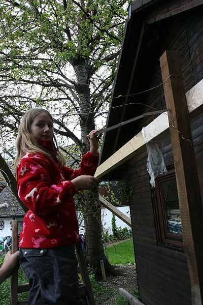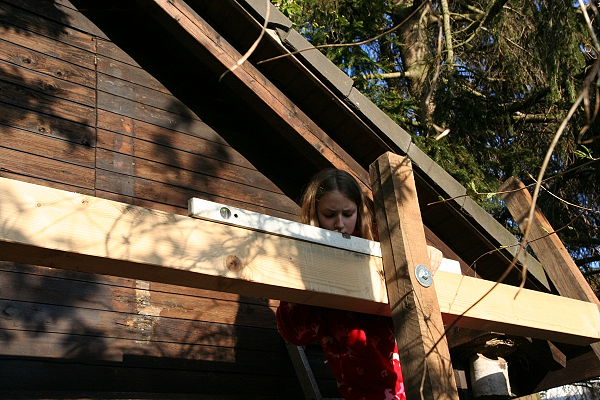 Auch diesen kleinen Balken haben wir dann flux mit dem Gartenhaus und dem waagerechten Baumhausbalken verbunden.