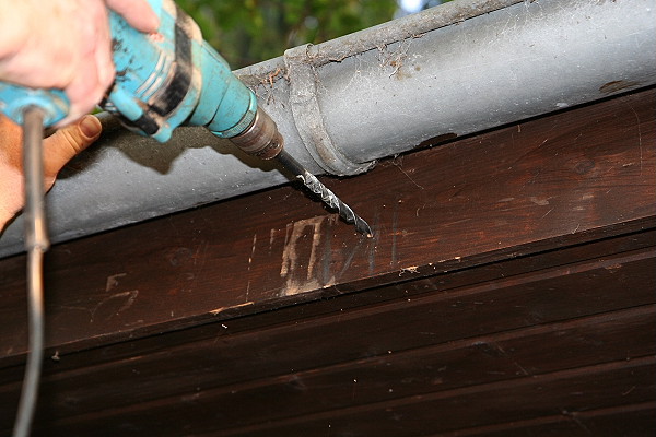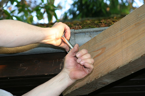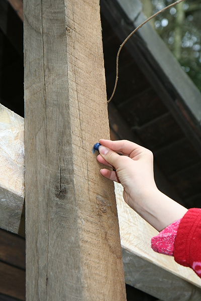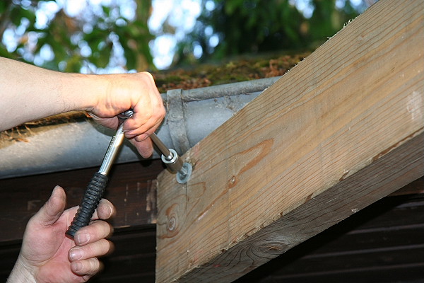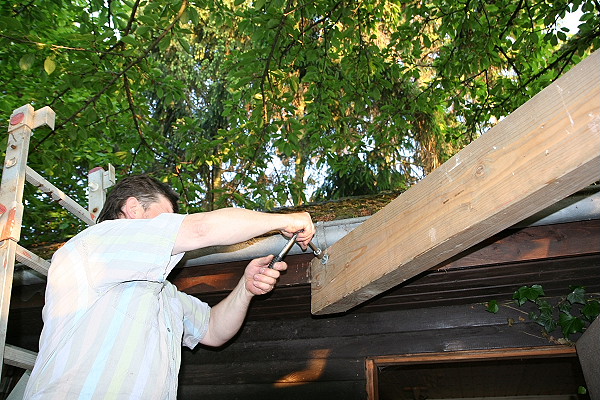 Um ihn an einem der Sparren des Gartenhauses zu befestigen, mussten wir zunächst herausfinden, wo sich diese befinden, dazu haben wir einige Ziegel hoch geschoben und mit der Hand gefühlt, ob sich dort ein Sparren befindet oder nicht.