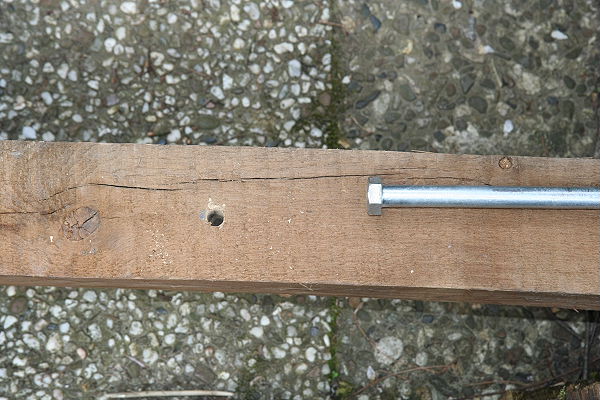 An dieser Stelle sollte der Bolzen durch den waagerechten Balken gezogen werden. Dazu war es erforderlich , dass wir auch hier eine Bohrung der gleichen Größe vornahmen.