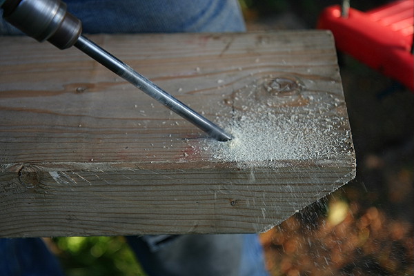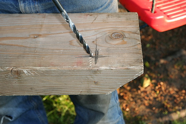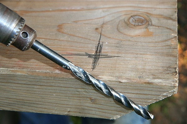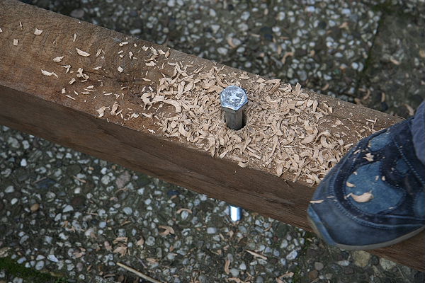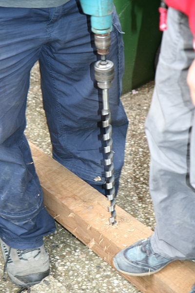 Dann machten wir an dem Kreuzungspunkt des senkrechten und waagerechten Balkens eine blaue Markierung. An dieser Stelle sollte eine Schraubenverbindung angebracht werden. Als erstes bohrten wir mit einem Bohrer ein Loch durch die Stütze, aber das Loch war dummerweise zu klein. Also mussten wir einen großen Holzbohrer holen, um das Loch auf die richtige Größe zu bringen.
