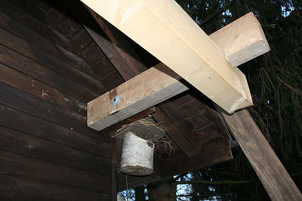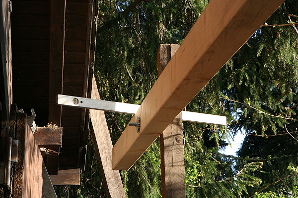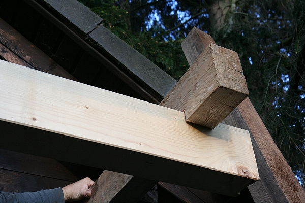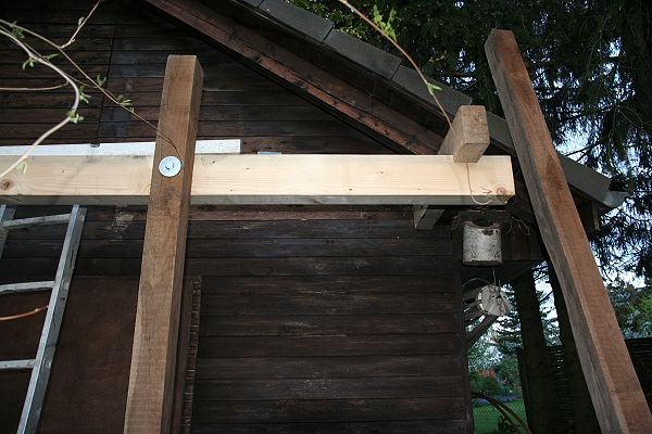Jetzt konnten wir die provisorisch aufgestellt Leiter unter dem waagerechten Balken entfernen. Die Konstruktion stand von alleine.Da der waagerechte Balken in Querrichtung noch etwas wackelte, haben wir noch einen kleinen Balken angefertigt, der eine Verbindung zum Gartenhaus herstellen sollte.