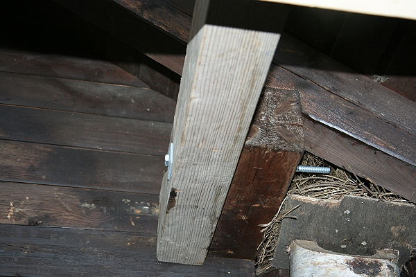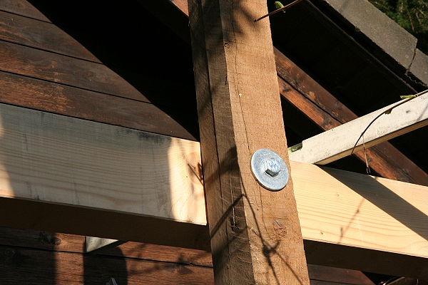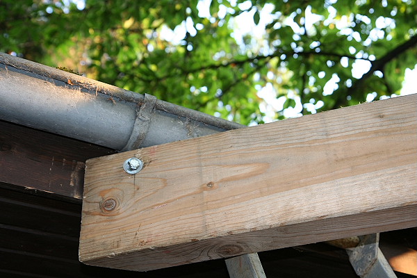 Nachdem alles verschraubt war, stellten wir entsetzt fest, dass die Befestigung am Sparren nicht ganz ausreichte. Das bedeutete, dass wir zusätzlich einen Stützpfahl an bringen mussten. :o