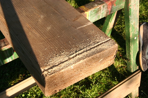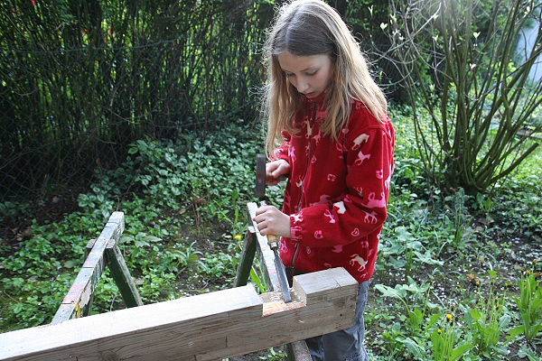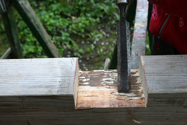 An diesem kleinen Balken mussten wir eine Ausklinkung herstellen, dazu sägten wir erst einemal parallel ins Holz. Da wir das Holz dazwischen nicht aussägen konnten, holten wir uns ein Stemmeisen, um das Stück in mühseliger Handarbeit heraus zu bekommen. Aber das ging dann doch recht flott.