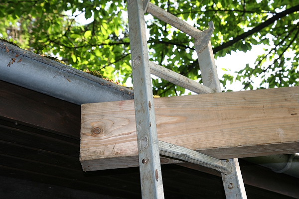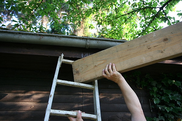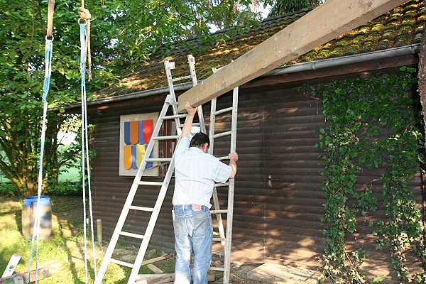 Die Leiter wurde geholt und wir versuchten den Balken in seine endgültige Position zu bringen.