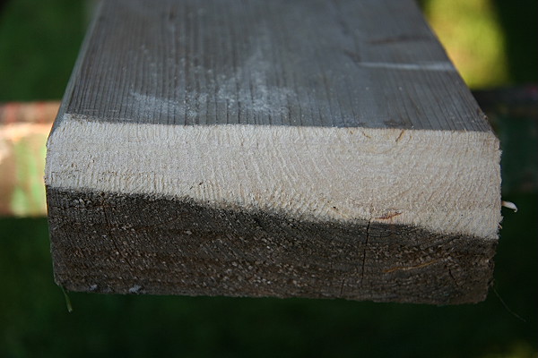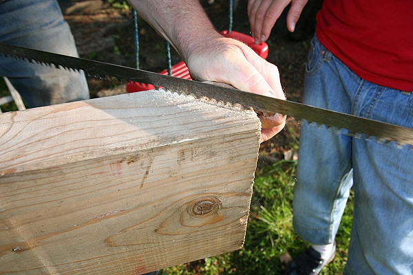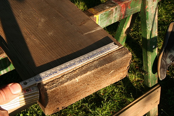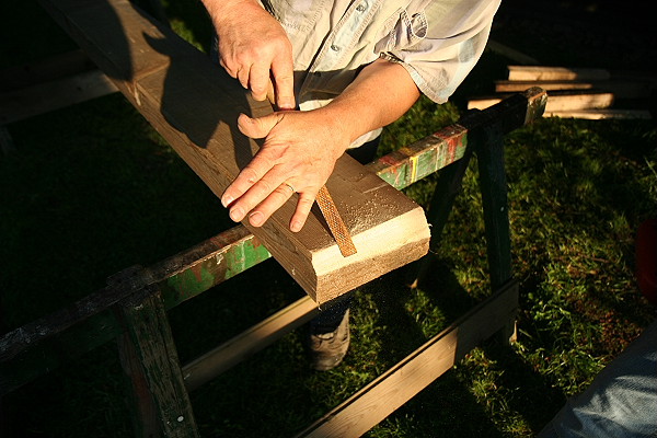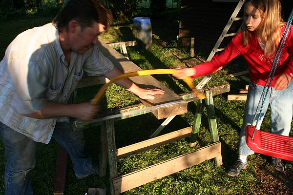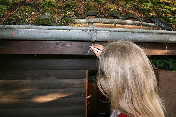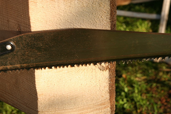 Da er nicht im rechten Winkel an das Gartenhaus anschloss, mussten wir eine Schmiege anschneiden. Dazu machten wir mit dem Bleistift exakte Markierungen und dann kam die Bügelsäge zum Einsatz (für mich ist das eine Zugsäge) -