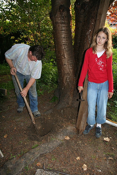 Das war allerdings nicht ganz so einfach, denn dort wo wir das Loch für den Stützpfeiler ausgraben wollten, trafen wir auf riesige, dicke Baumwurzeln vom über 30 Jahre alten Kirschbaum.