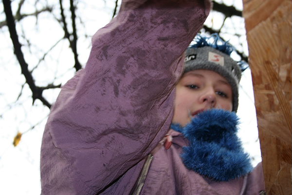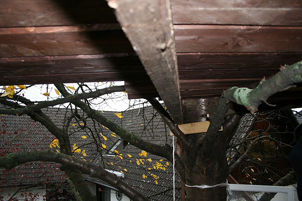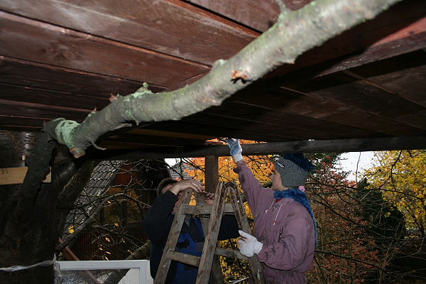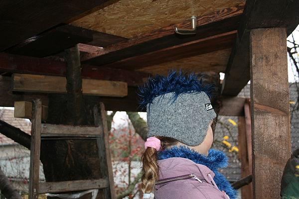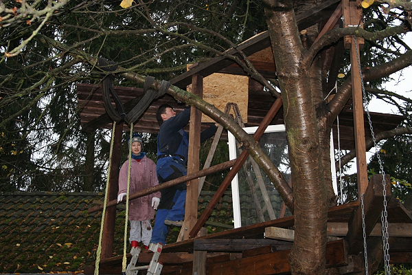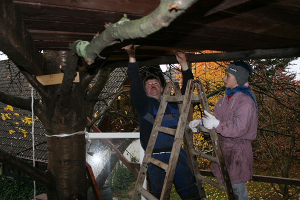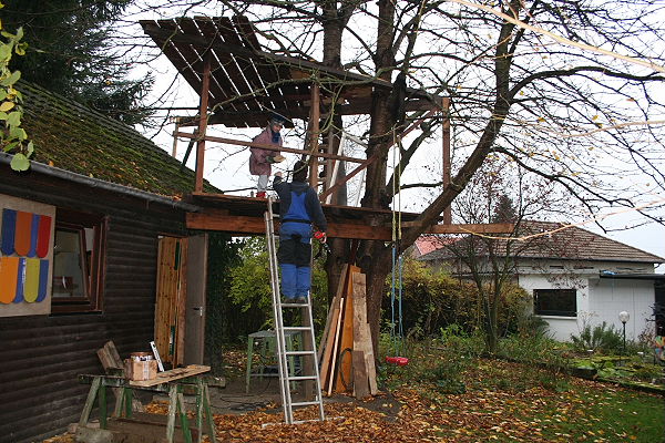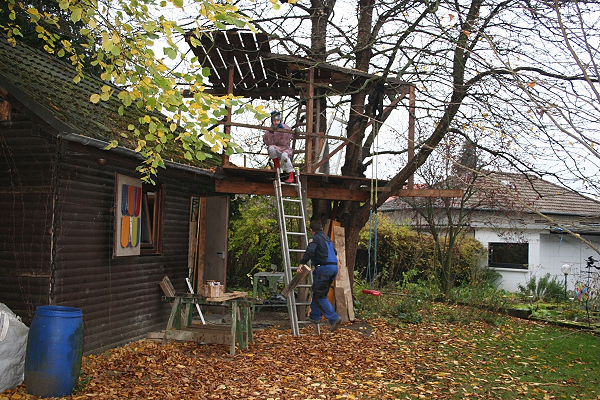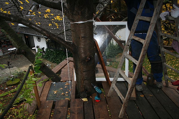 Die Decke über der ersten Baumhausetage wurde somit vollendet. Damit man diesen Bereich auch als Fußboden für die nächste Etage benutzen kann, haben wir eine Lukenöffnung gelassen.