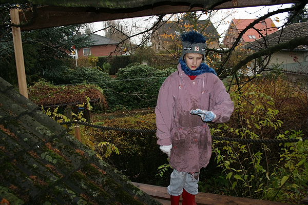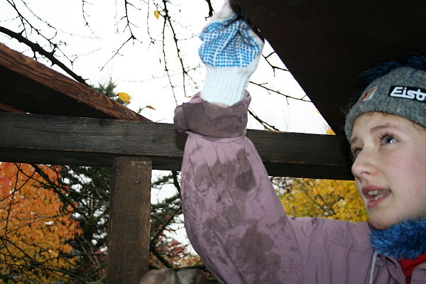 Zu diesem Zwecke habe ich noch 2 Holzstützen passend geschnitten und Jenni hat diese mit Holzschutzfarbe gestrichen.