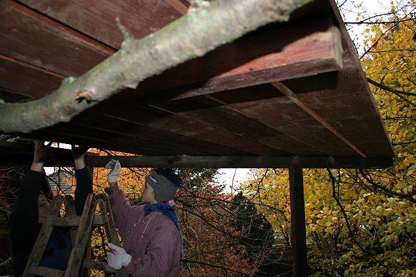 Die restlichen Fußbodenbretter für die Decke über der ersten Etage habe ich besorgt und Jernni hat sie mit Holzschutzfarbe gestrichen und anschließend wurden die Bretter angebracht. Dabei haben wir auch ein paar kurze ausgetauscht.