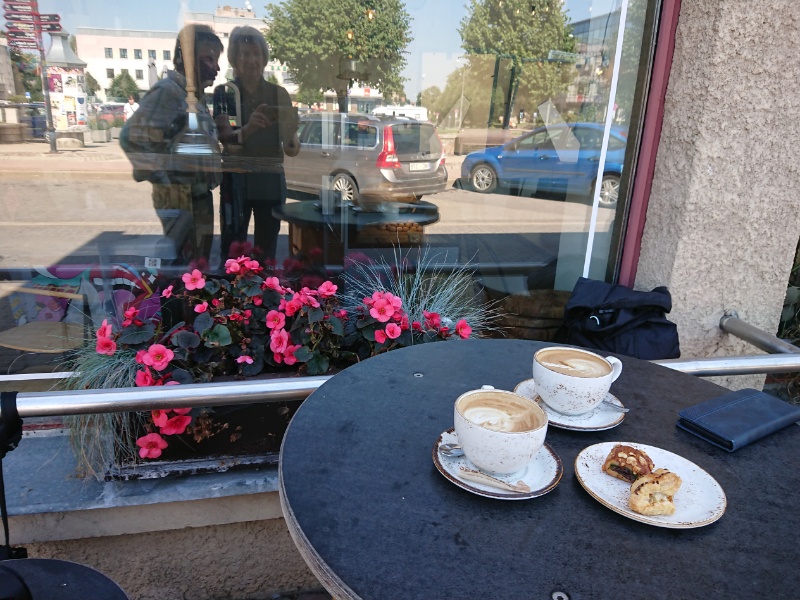 Gestern haben wir schon eine große Runde gedreht, eben waren wir auf dem Adau tornis und nun brauchen wir eine erste Stärkung und sitzen vor dem Pi Café.