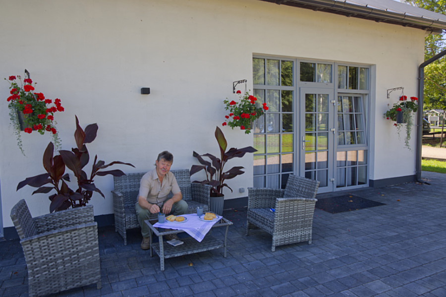 Die Vermieterin vom Guest House Vītoli kam kurze Zeit später extra angefahren. Wir können 2 Nächte bleiben, sie hat aber nur ein Dreibett-Zimmer frei. Es gibt ein Gemeinschaftsbad, draußen im Garten Sitzgelegenheiten, eine überdachjte Terrasse, ja hier gefällt es uns und alles sieht sehr gepflegt aus. Wir haben ja lieber ein Bad für uns alleine, aber es geht auch mal anders.