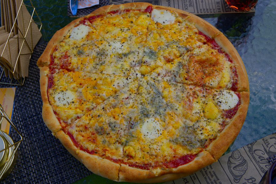 Da fuhren wir und staunten wieder. Sie hat ihren Garten zu einem Restaurant umfunktioniert, ein umgebauter Wohnwagen diente als Küche. Wir bestellten und ein 35 cm Pizza, es gab nur 4-Käse. Das war uns recht. Sie schmeckte vorzüglich!