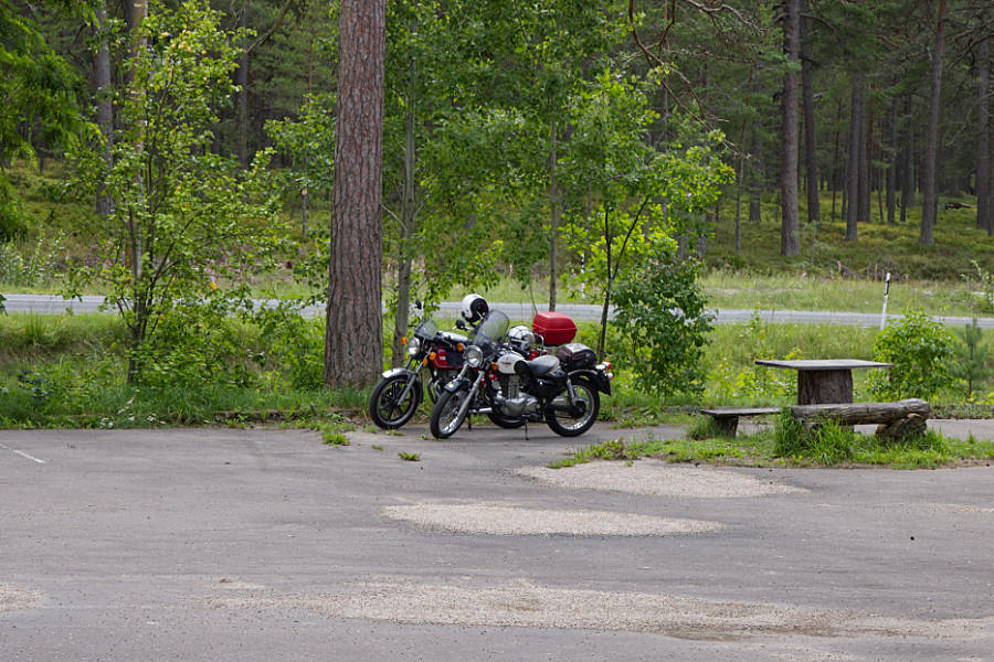 Auch in Kemeri bleiben wir nicht lange. Das war eine gute Entscheidung, denn als wir mit den Motorrädern wieder in unserer Unterkunft angekommen sind, fing es tatsächlich wieder an zu regnen. Wir haben aber noch einmal kurz am Supermarkt gehalten und ich habe frischen Salat und noch ein paar Kleinigkeiten für unser Abendessen eingekauft.