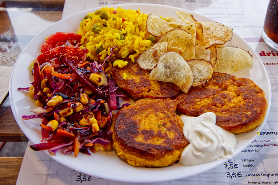 Das war ein Glücksgriff, es ist nur ein Straßenlokal mit wenigen Plätzen. Wir hatten Glück, ein Tisch war noch frei. Die Speisekarte ist übersichtlich, aber, es wird alles frisch zubereitet. Friedrich aß Tintenfisch und ich bekam ein superleckeres vegetarisches Gericht mit selbstgemachten Kichererbseb-Burger, Reis, Chips und Salat.
