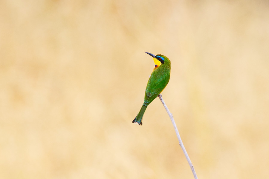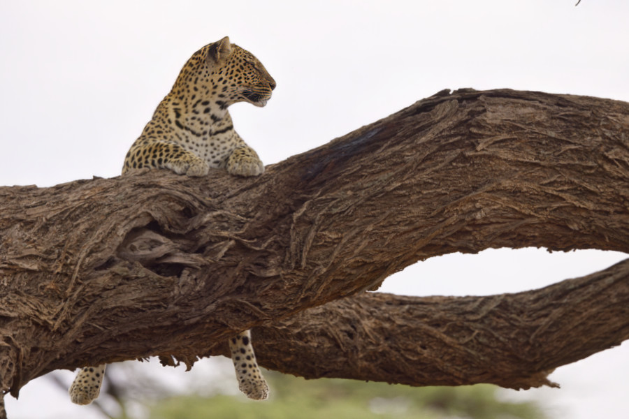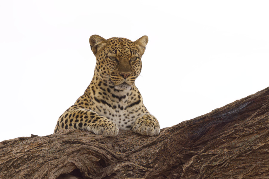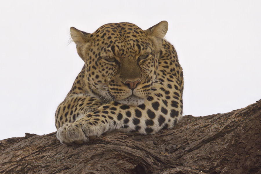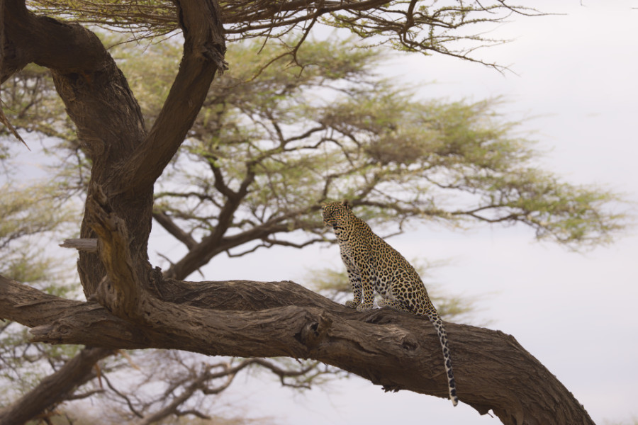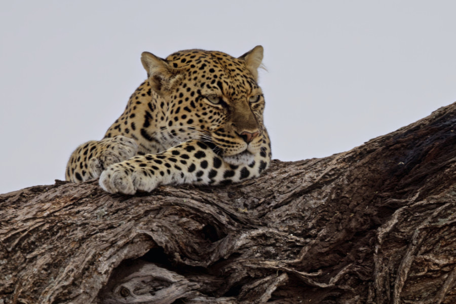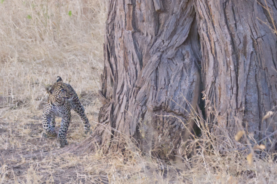 In der Savanne versteckt sahen wir den Geparden, aber so schnell wie er da war, war er auch wieder verschwunden. Der Guide wusste aber, wo er sein Fressen versteckt hat und wir fuhren dahin. Unterwegs sahen wir so allerlei, Giraffen, Roller, Krokodil , Reiher und dann kamen wir an den Baum. Da sahen wir ihn dann sitzen.
