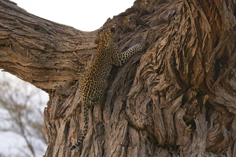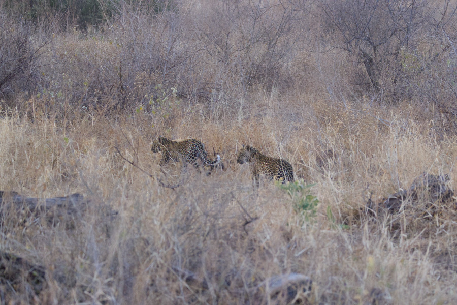 Neben den faul im Gras liegenden Löwen, gab es wieder ein weiteres Highlight, denn wir entdeckten den Leoparden-Nachwuchs. Die Mutter saß schon im Baum und die beiden niedlichen Kleinen liefen erst um den Baum herum, Wie kommt man da nur hoch?