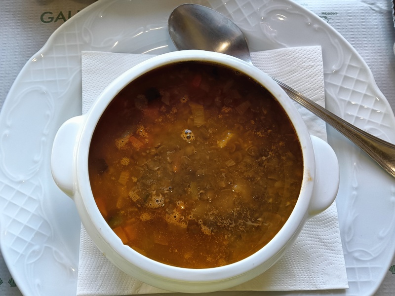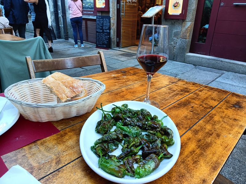 Ich entdeckte die Tafel mit den Pilgermenüs. Genau so etwas brauchten wir. Wir wählten das vegetarische Menü zu 8.50€, das war richtig lecker, dazu dann ein Glas Wein 🍷 oder 2 oder 🍻 zum Schluss gab es dann auch noch einen schönen Stempel.😃