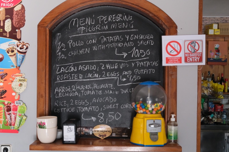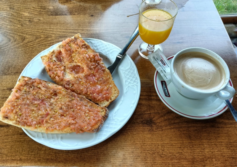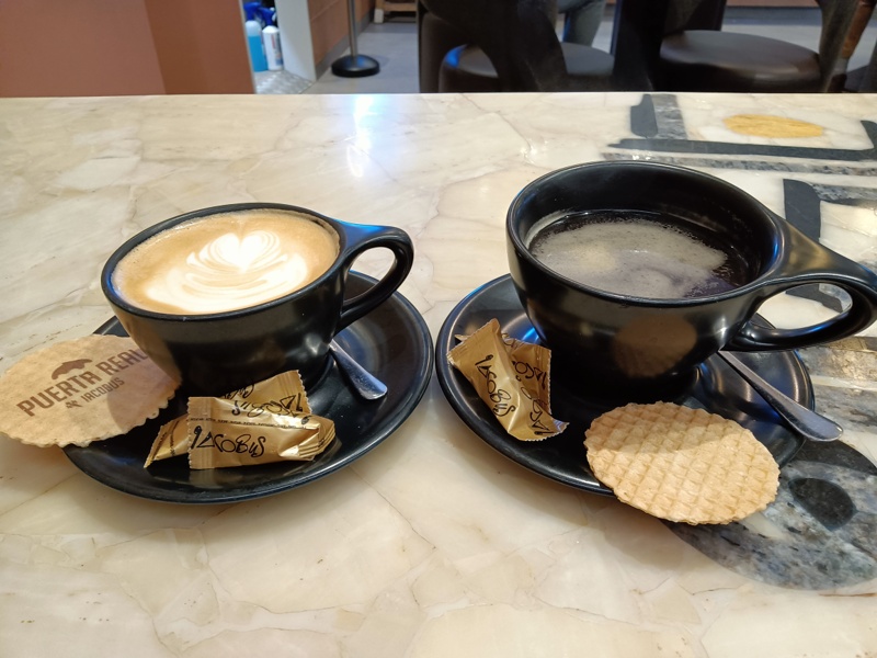 In unserer Unterkunft wurde kein Frühstück angeboten, so machten wir uns auf die Suche. Um diese Zeit hatten tatsächlich noch viele Geschäfte zu. Nach einem kurzen Spaziergang und einer kleinen Google-Anfrage fanden wir dann das nette geöffnete Café Jacobus. Kaffee, Tostada, Orangensaft und Churros, das war ein ordentliches Pilgerfrühstück. -