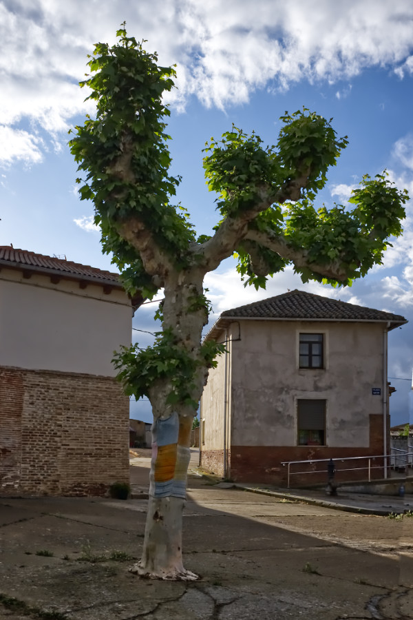 Früher hat jede Familie ihren eigenen Wein gekeltert und somit für ein Jahr vorgesorgt. Heute machen nur noch wenige Familien ihren eigenen Wein. Die Bodegas werden aber teilweise immer noch für den Vorrat genutzt, manche aber auch für Partys etc. Auf dem Dorfplatz sehe ich einige Bäume, diese sind am Stamm bunt bestrickt. Was das für eine Bedeutung hat, ich konnte keinen mehr fragen.