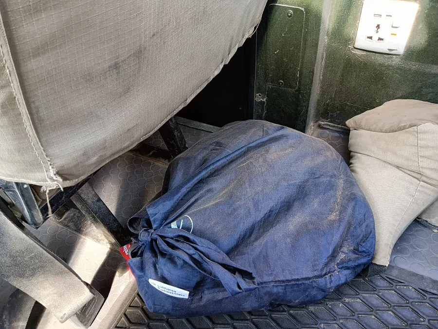 An diesem Tag hieltenn wir uns den ganzen Tag im Park auf, es gab nur zwischendurch eine kurze Mittagspause. Schon vor Sonnenaufgang sind wir unterwegs. Alles ist gut eingepackt, denn der Staub ist überall. Da wir fotografieren wollen, sind alle Fenster und auch das Dach geöffnet. Da hilft es nur noch, eine Maske zu tragen.