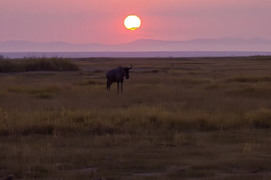 Als erstes habe ich einige Bilder vom Sonnenaufgang, wir sahen Blue Wildebeasts (Gnu) und Elefanten in der aufgehenden Sonne. Hier hätte ich gerne ein Stativ gehabt. In der Ferne sahen wir sogar den Mt. Kilimanjaro.