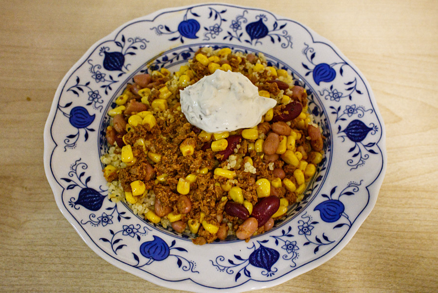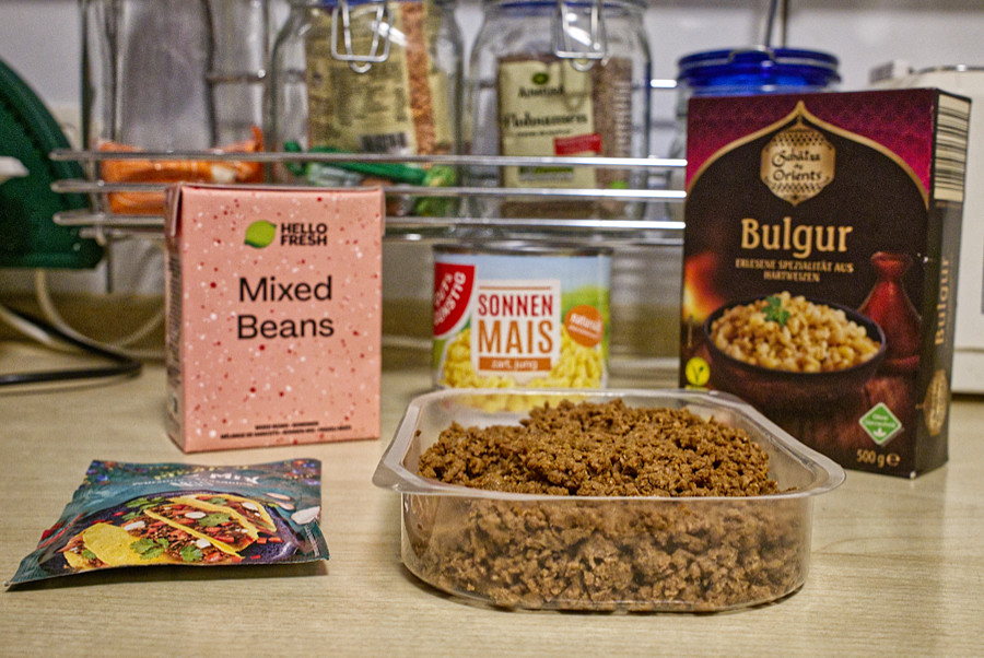 Heute gab es bei uns ein zusammengewürfeltes Gericht, denn das Veggie-Hack musste verarbeitet werden. Von Jenni habe ich 2 Packungen Bohnen-Mix bekommen, da die Familie ihrer Mutter diese nicht mag. Zufällig hatte ich auch noch 1 Dose Mais, 1 Würzmischung von Don Enrico Mexico: Taco Mix Würzung-Seasoning, ebenso wie 1 Becher Crème fraîche mit Kräutern (auch ein "Fehlkauf") und 1 Glas Don Enrico Mexico Pineapple Tomato Salsa (medium). Die Packung Bulgur hatte Friedrich auch mal einfach so mitgebracht.