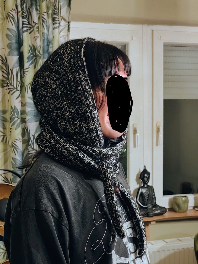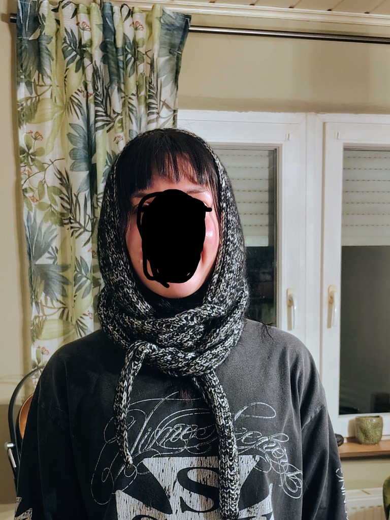 Ich habe für Laura zu Weihnachten einen wirklich warmen Kapuzenschal gestrickt.