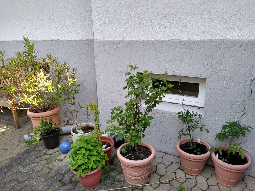 Tomaten, Johannisbeere und Blaubeere, Minze und Zitronenmelisse mussten übergangsweise auf den Hof ziehen.