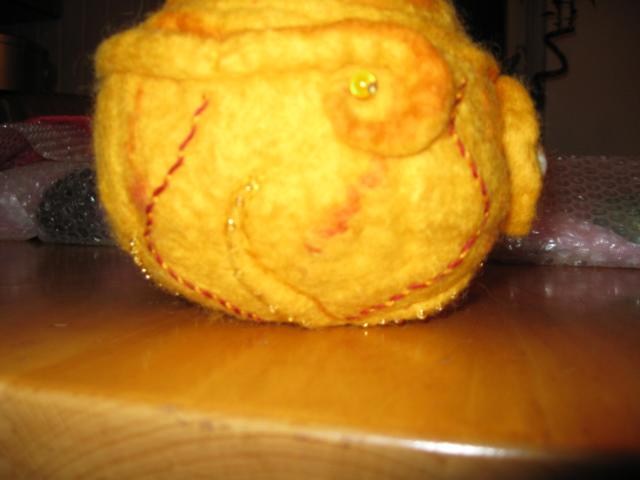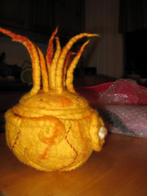 Die "Sonnenstrahlen" sind extra angefilzt und später auf den Deckel aufgesetzt und mitgefilzt, ich wollte Relieftechnik einsetzen, habe aber gemerkt, daß man dazu Schnüre oder Muster vorfilzen muß, weil es sich sonst wieder verliert...