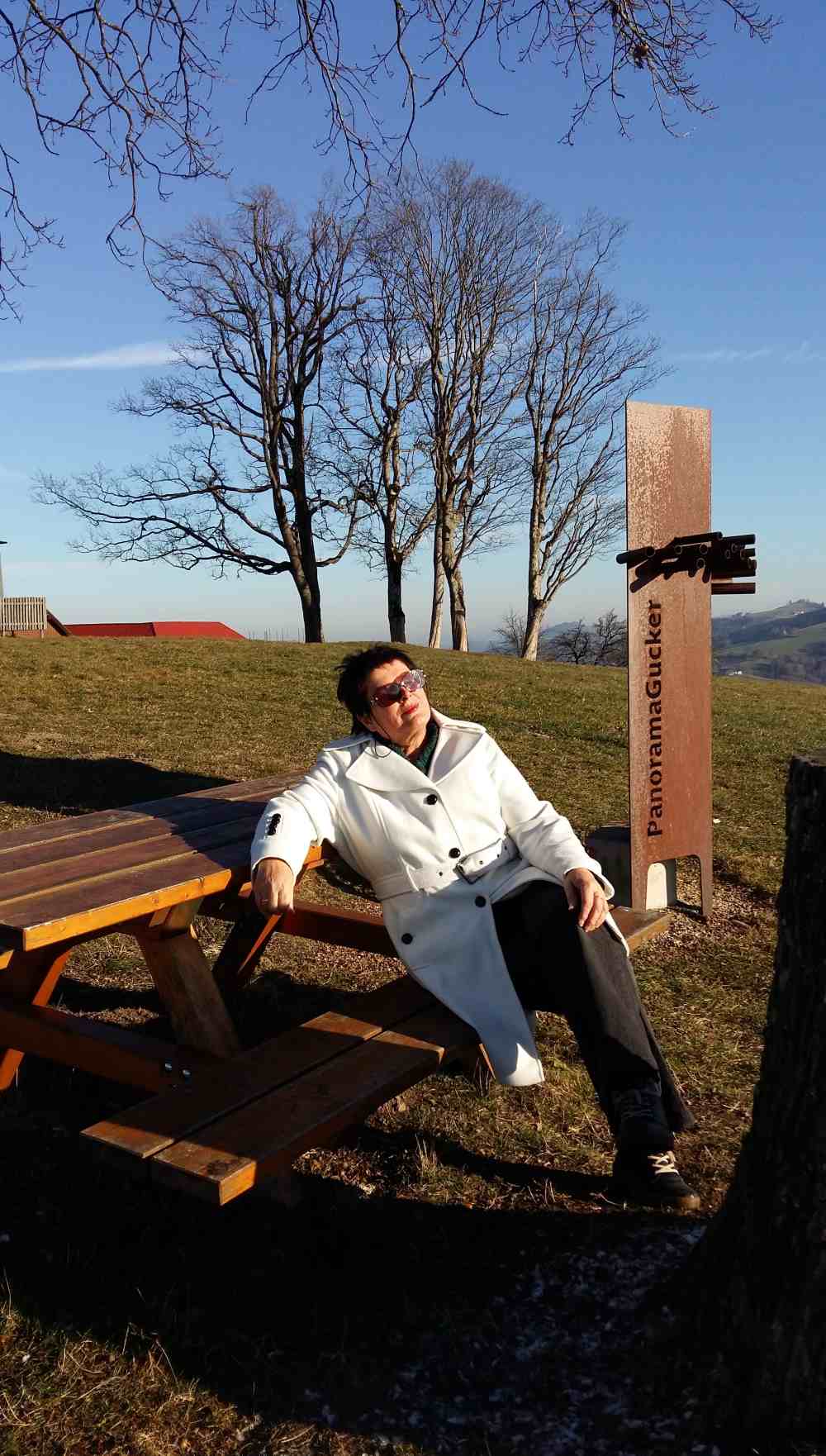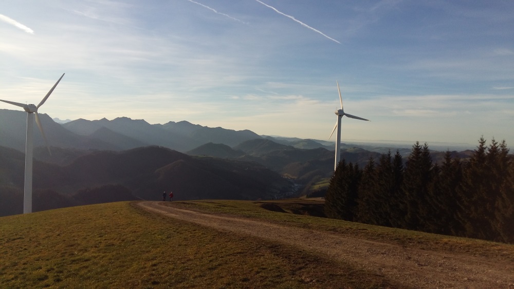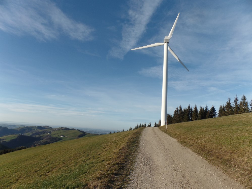 Wir fuhren also runter und dann wieder rauf und hier waren sie; 3 Windräder und wieder ein herrlicher Rundblick und warme Sonnenstrahlen, die wieder zum Sitzen auf einer Bank verlockten.