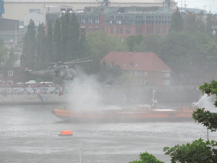 Ein Schiff brannte, Löschboote kamen um zu löschen, ein Hubschrauber barg die Passagiere mit dem Rettungskorb, tolle Aktion vor unseren Fenstern.