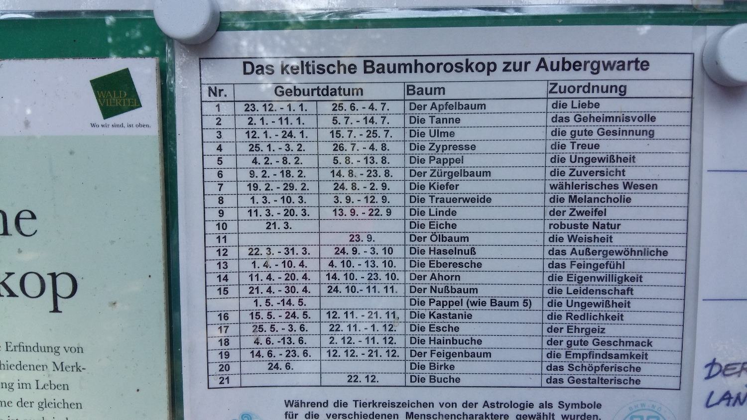 Auf den Tafeln stehen die Eigenschaften laut Keltischem Horoskop. Ich bin jedenfalls ein Nußbaum und Sigi eine Haselnuß.