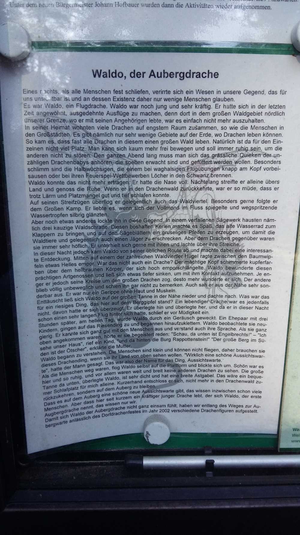 Ich war dort schon 2 mal zur Kur und hab mir aus den Infomappen die da aufliegen die Sehenswürdigkeiten abgeschrieben und heute haben wir die Aubergwarte besucht. Man wandert durch einen schönen Wald mit einigen Holzdrachen und Tafeln, auf denen die Baumnamen geschrieben sind empor.