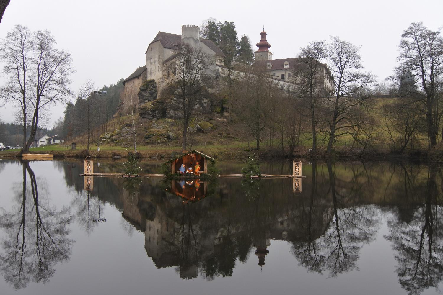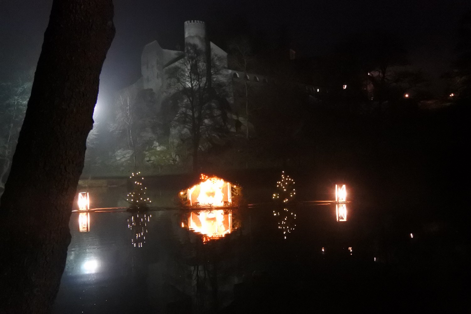 Das Schloss liegt über einem Teich in dem eine Art Floß befestigt war. Darauf war eine Krippe aufgebaut und 2 große Laternen, das sah gleich beim Eingang sehr schön aus.