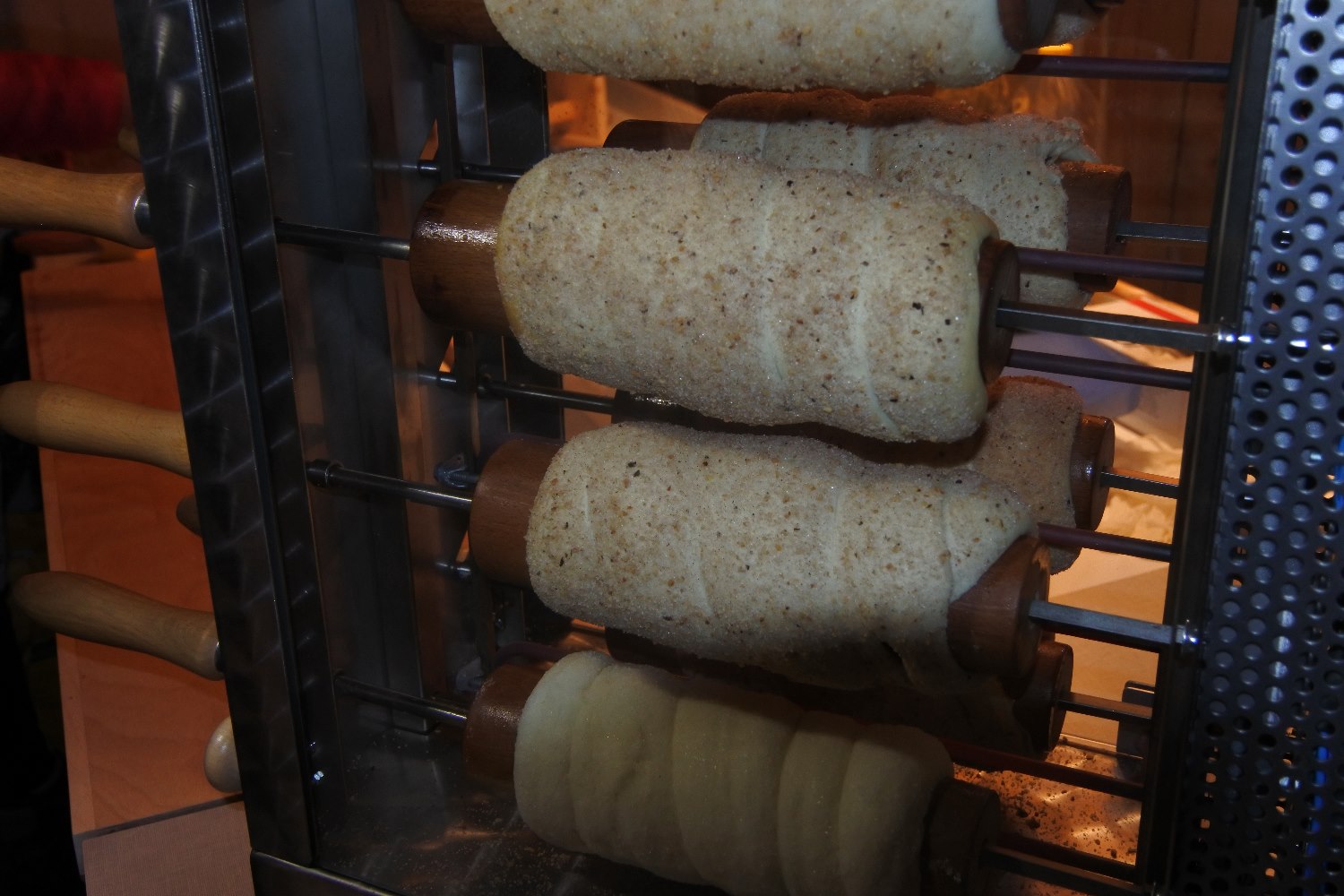 Das ist Germteig, der in Schlangen um eine Rolle gewickelt wird, mit Zucker und Zimt bestreut und im Ofen gedreht bis es bräunlich wird. Nicht gefüllt, einfach in ein Säckchen und Stückchen runter reißen oder beißen. Schmeckte köstlich.Danach sahen wir auch noch alte Ausstellungsstücke an, die man nicht kaufen konnte sondern nur bestaunen, überall flammten nun Lichter auf, Weihnachtlieder wurden gespielt aber immer nur mit echten Musikern, keine CD`s.