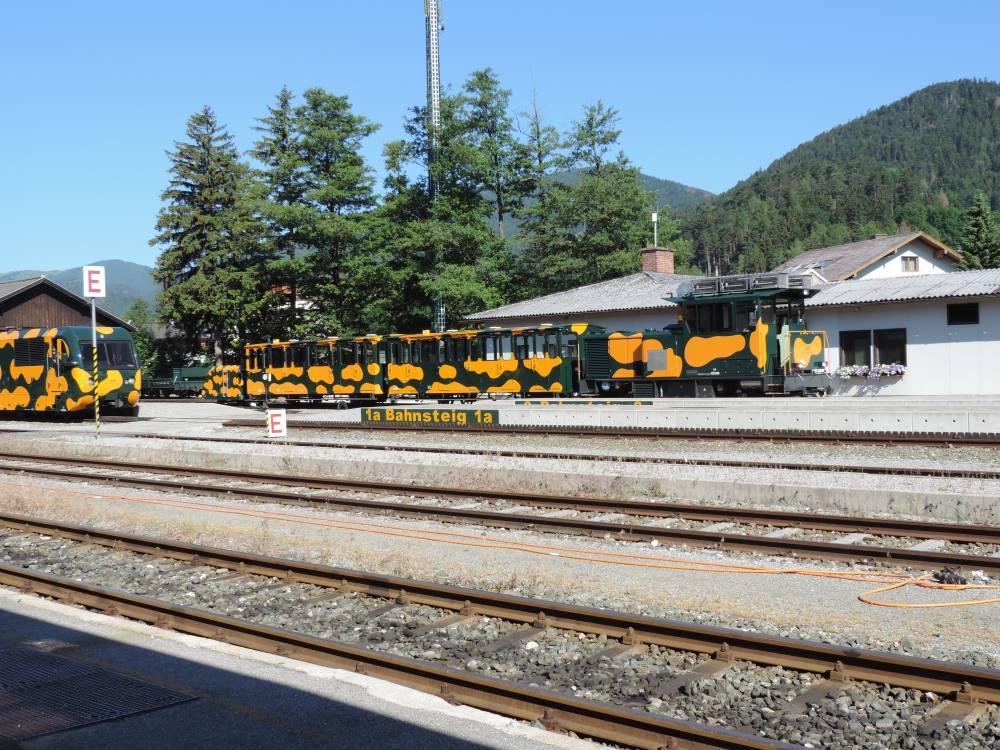 Es gibt verschiedene Züge; Sonntags und auf Vorbestellung eine Nostalgie Dampfbahn und ansonsten zwei verschiedene neue Garnituren, die wir heute ausprobierten.Die Züge haben den Namen Salamander und sind dementsprechend auch so bemalt.