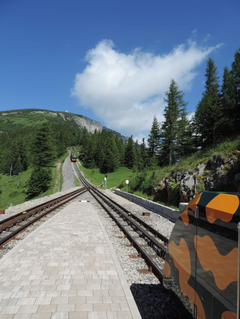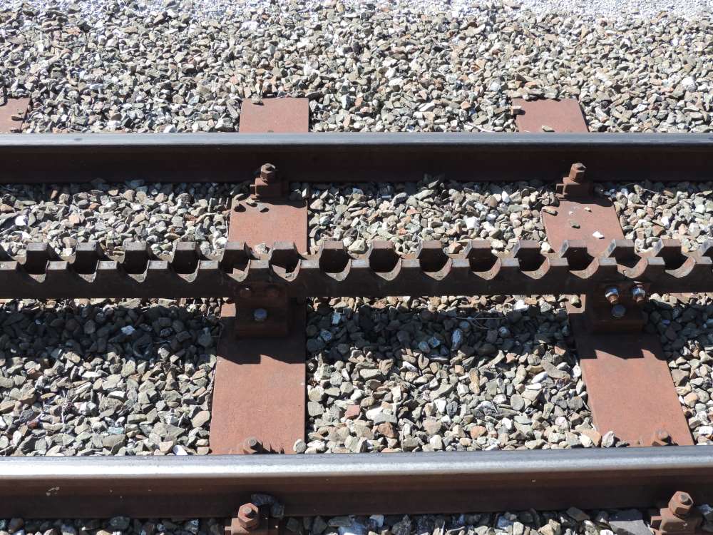 Es gibt nur ein Gleis und darum Ausweichstellen wo sich die Bergauf- oder Bergab fahrenden Züge treffen. -