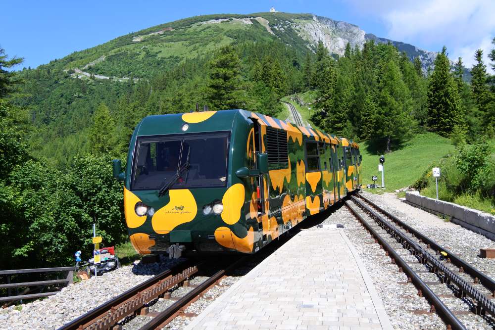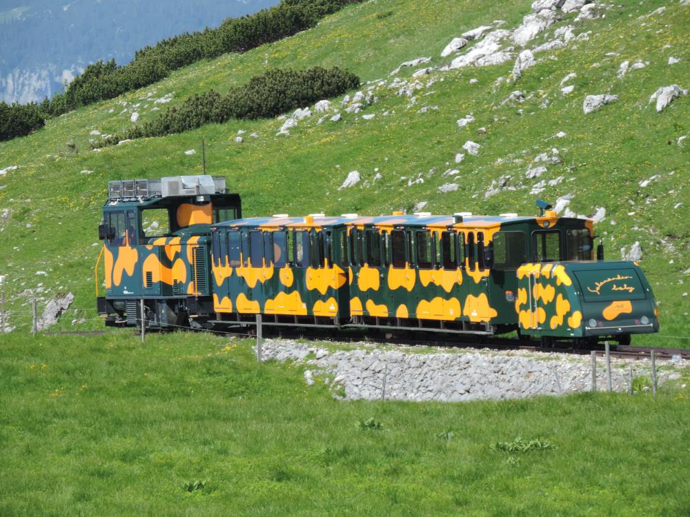 Man fährt mit einer Zahnradbahn auf 1800 m Höhe empor.