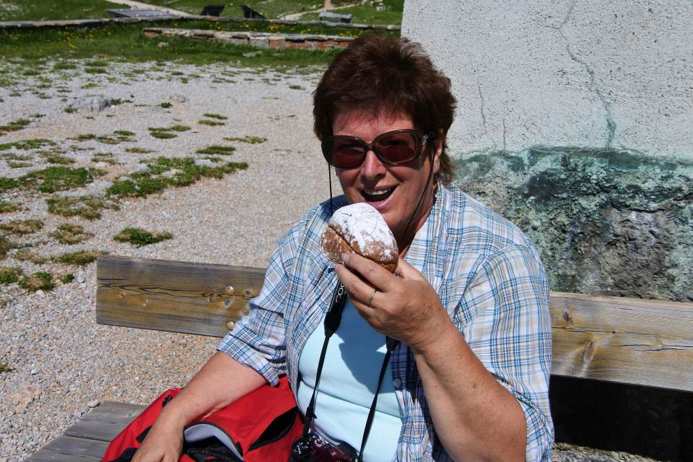 Dort befindet sich auch eine Hütte, deren Verkaufsschlager frische Buchteln sind – ein Germteiggebäck mit Marillen Marmelade oder Powidl gefüllt, angezuckert und noch warm.