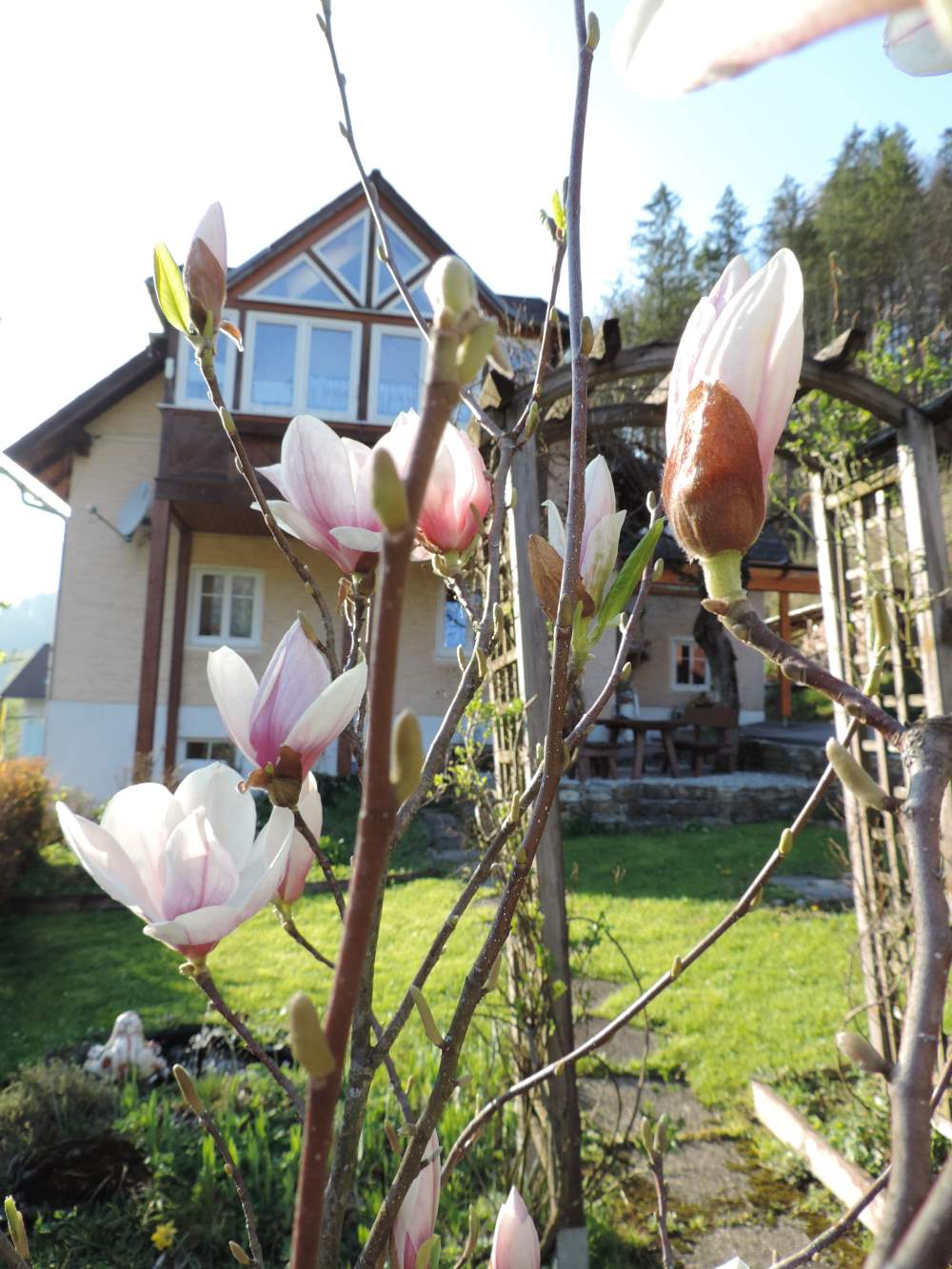 Und im Garten ist unsere Magnolie blitzartig erblüht und manches verblüht schon wieder. Das Bäumchen ist noch ziemlich klein, hat aber heuer viele Büten.