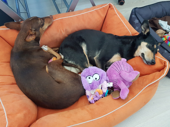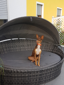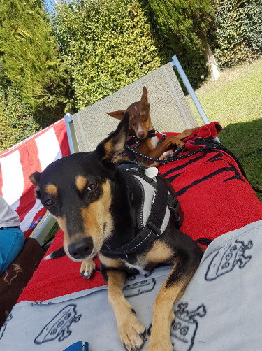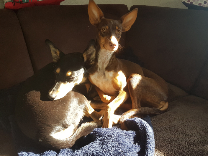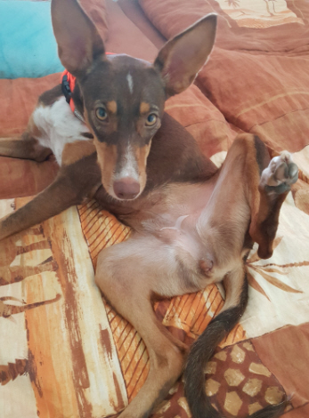 So wie es aussieht, ist es zu 95 % eine Podenca. Benita ist eine Podenca-Pinscher, wobei hier mehr der Pinscher durchschlägt, was man jetzt im direkten Vergleich auch gut sieht. Podencos sind immer sehr schlaksig. Mia hat aktuell 11 kg. Benita hat 12,3 kg. Also ein bisschen was kann, muss aber nicht, drauf.