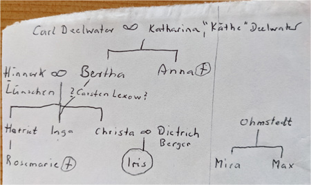 Und eigentlich ist es auch leicht zu lesen - aber ich muss gestehen: Mit den Namen und Verwandtschaftsbeziehungen tat ich mich schwer, darum habe ich mir selbst einen Stammbaum aufgezeichnet, der mir beim Lesen eine gute Hilfe war, s. Foto. ![]()