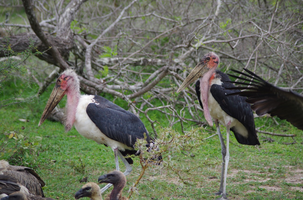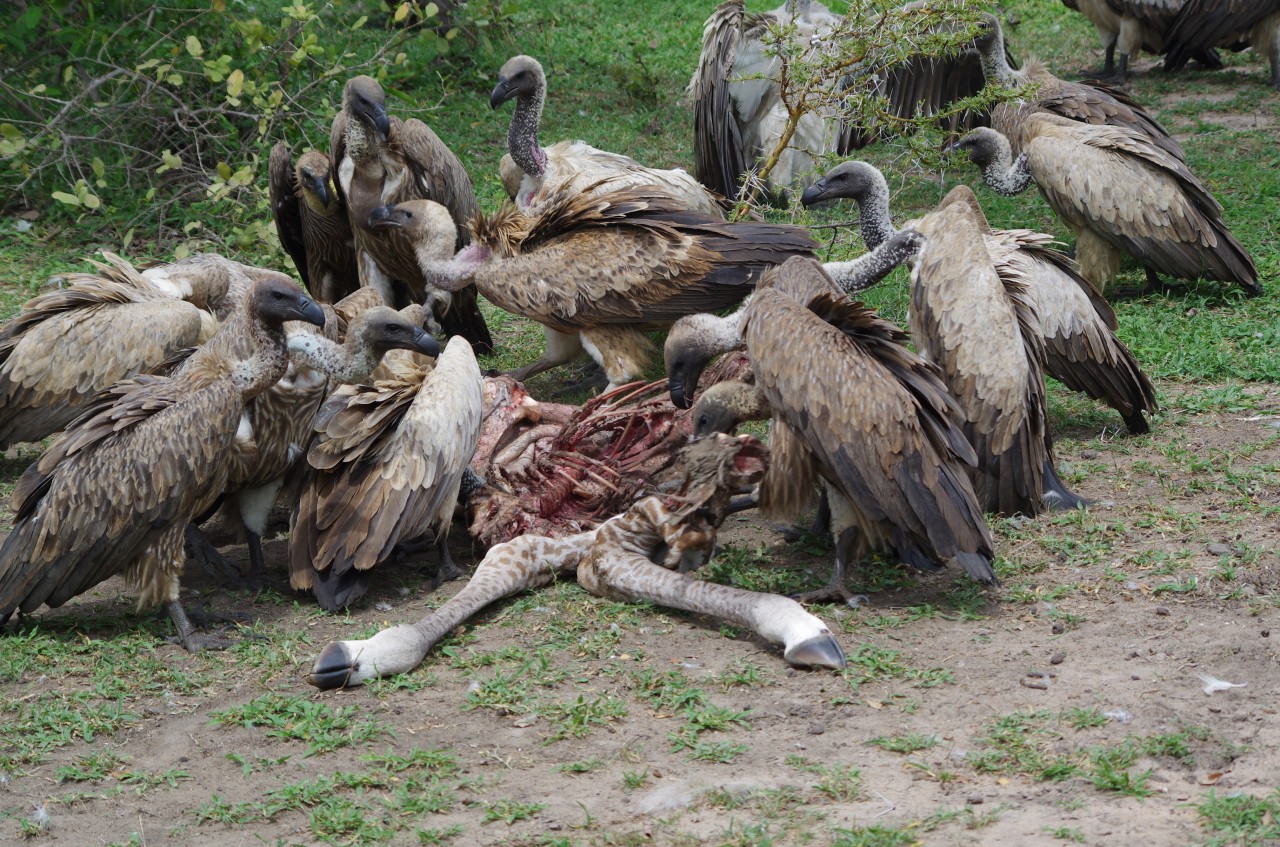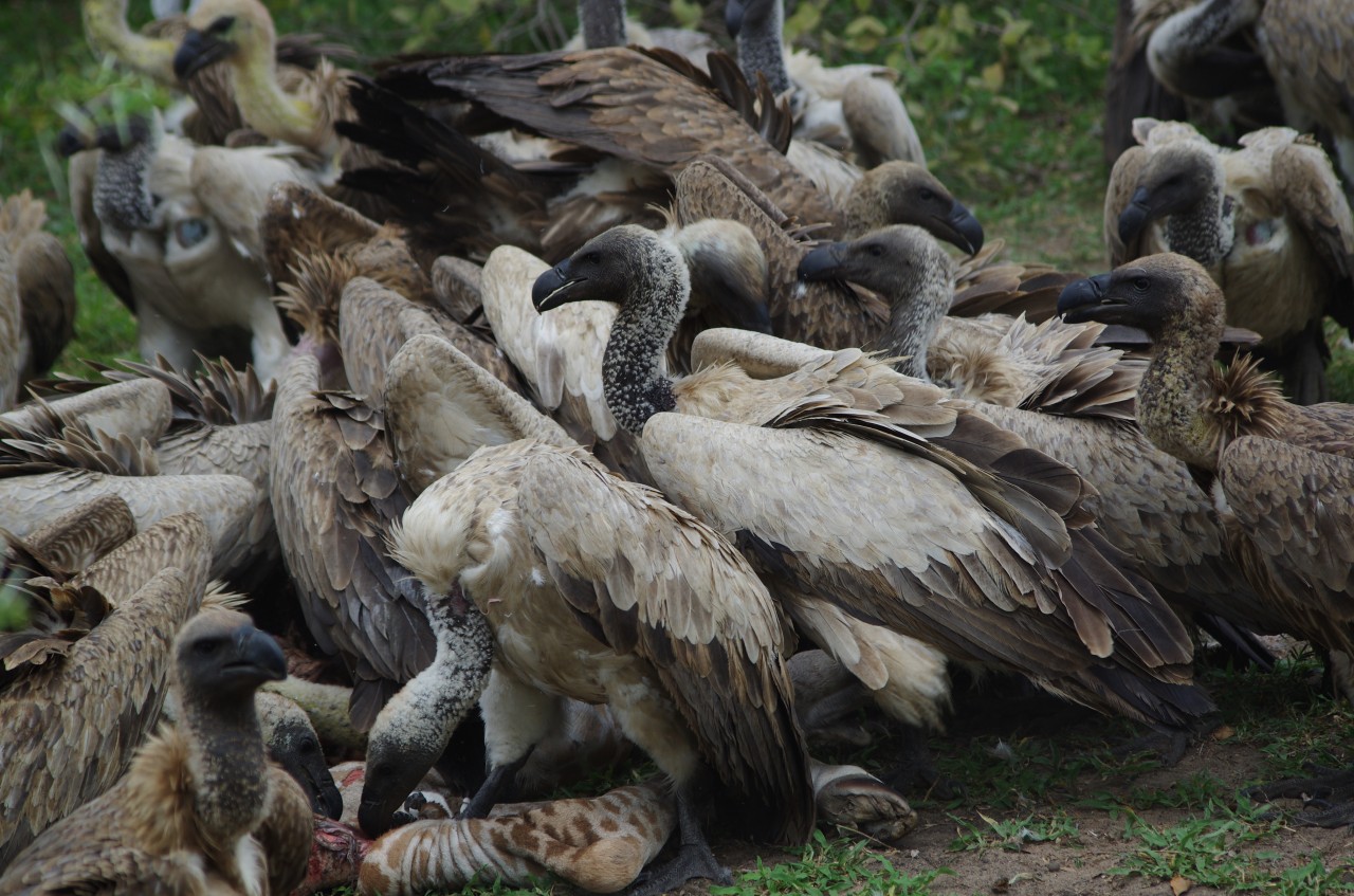 Diese neugeborene Giraffe wurde in ca. 20 Minuten von über 50 Geiern zerhackt, die Marabus haben sich die herumfliegenden Stückchen geholt.