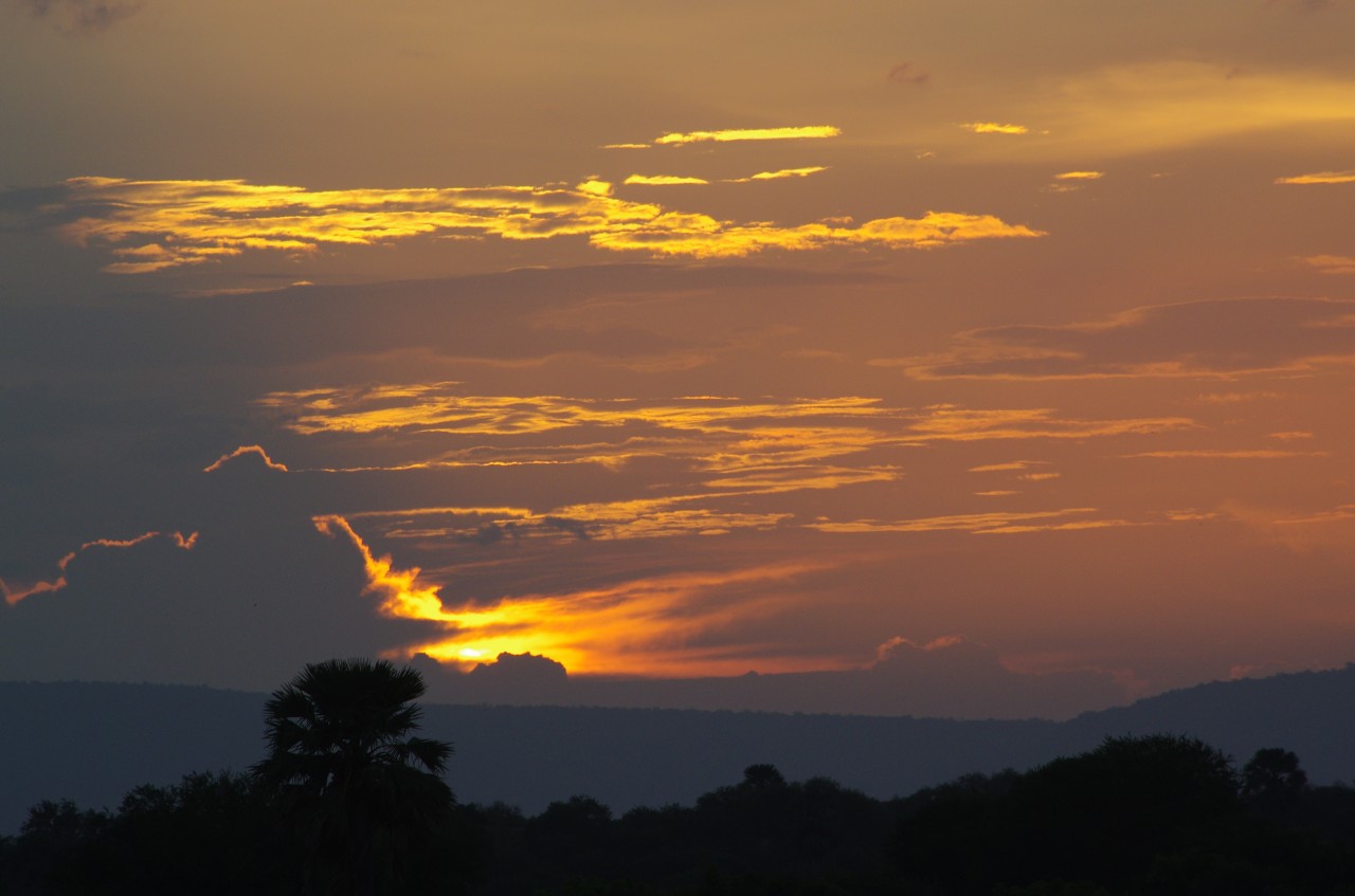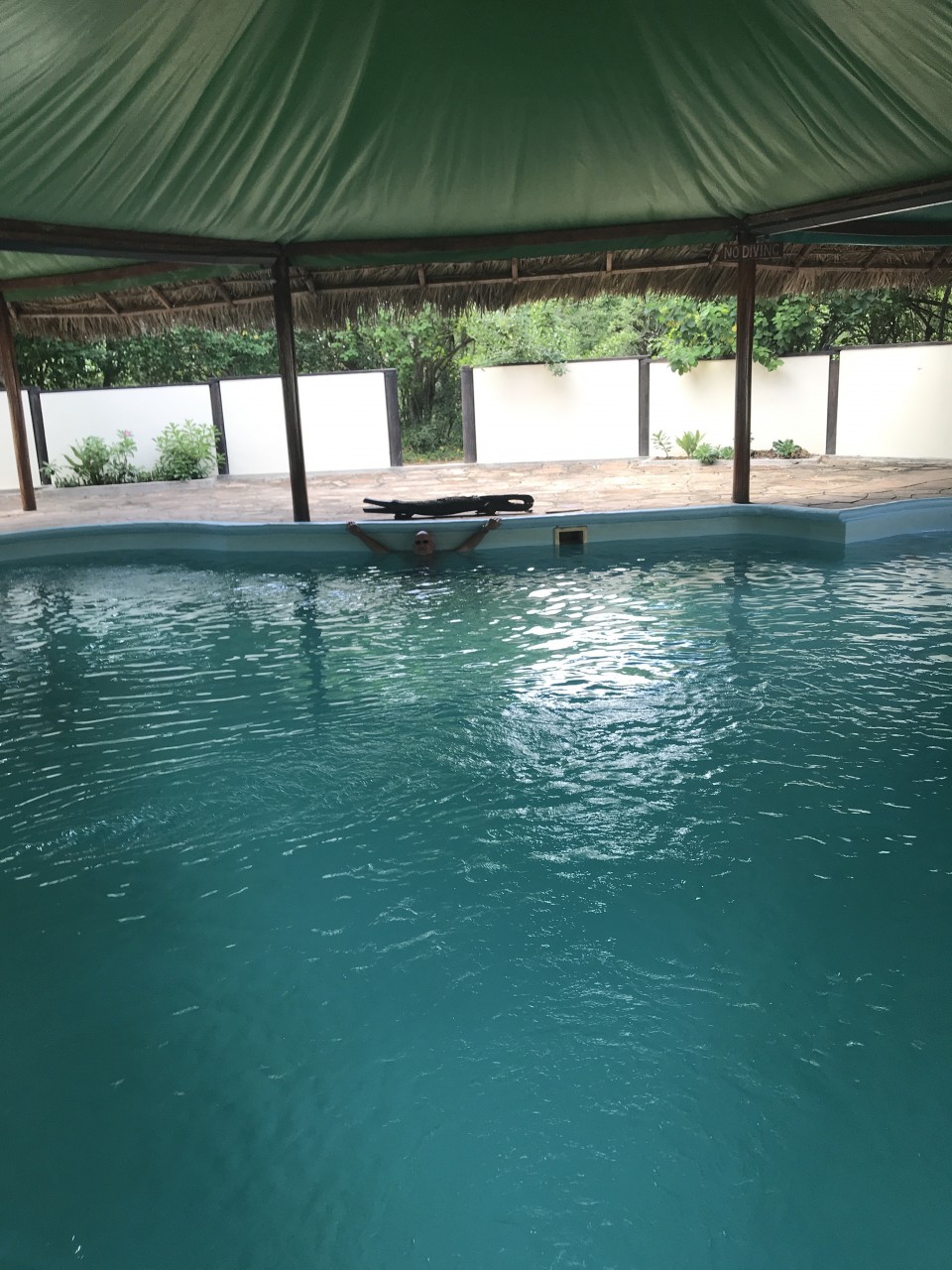 Unser Zelt, unser Pool (erfrischend kalte 29° bei 38° Lufttemperatur), unser Sonnenuntergang nach Rückkehr, mit einem leckeren Safari-Lager, ein paar Nüssen und auch daran interessierten Affenfamilien und Zebramangusten.