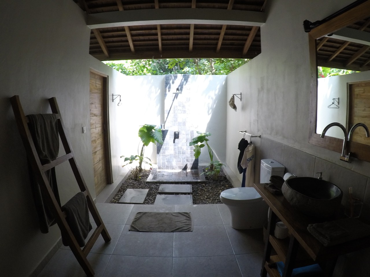 Eingang zum Dampfbad mit Schöpfbecken im Freien