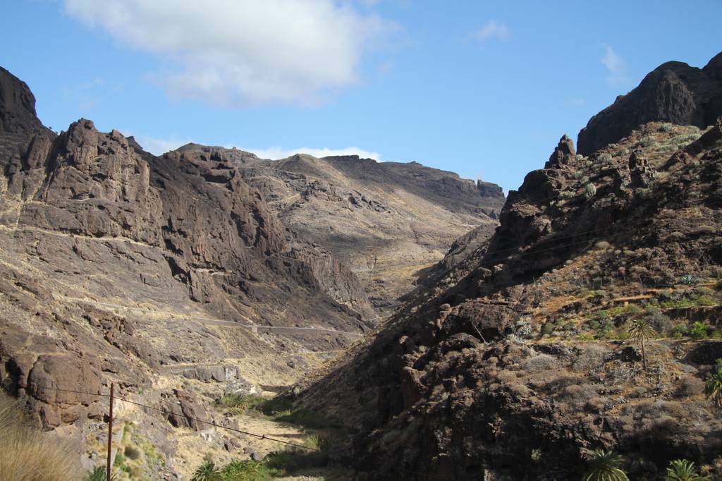 Man sieht auf die Schlucht von Fataga. Nach Fataga führt uns auch die Straße weiter