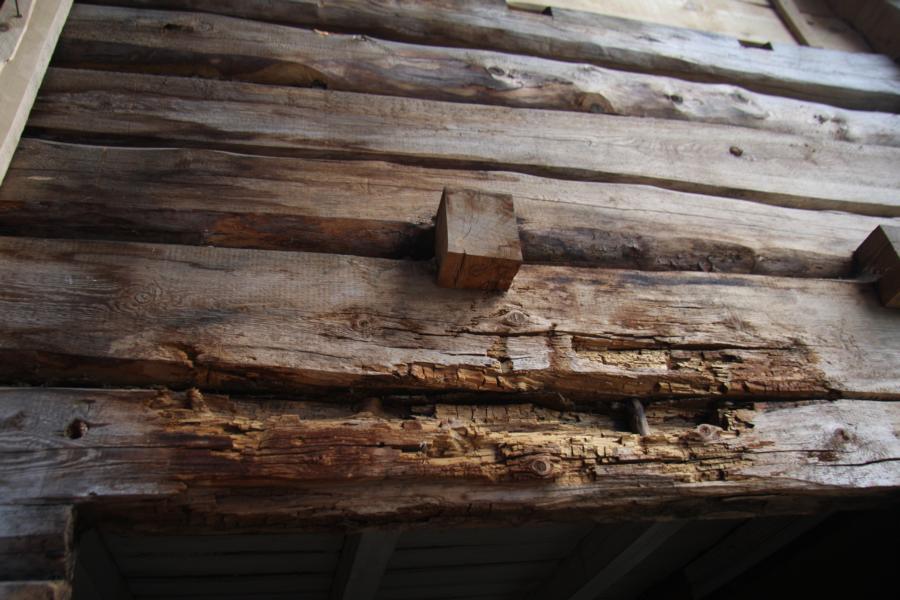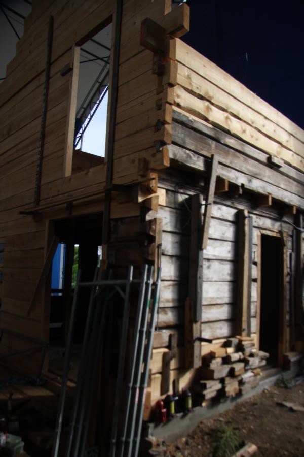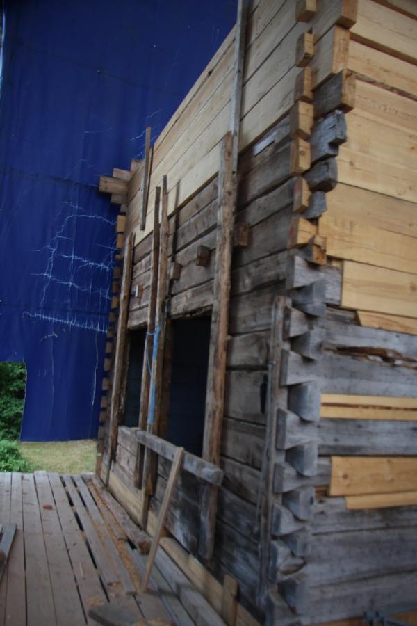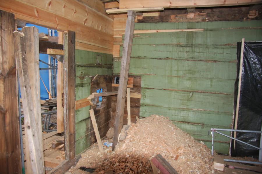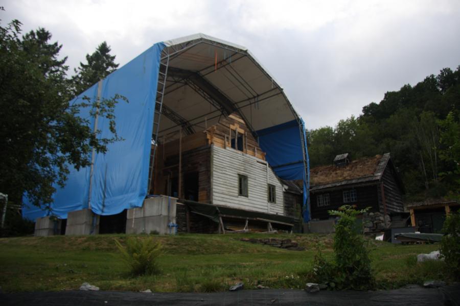 Unter einer riesigen Plane zum Schutz stehen diese beiden Gebäude, die stark zerstört sind. Ich meine, sie hat erzählt, kin Englisch, dass die Gebäude bis 1969 bewohnt waren, danach nicht mehr. Und entsprechend zerfallen sind sie. Ihr Bruder hat einen Polen eingestellt, der nun restauriert