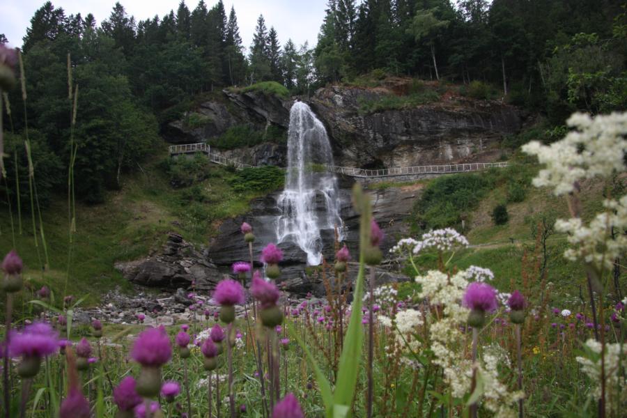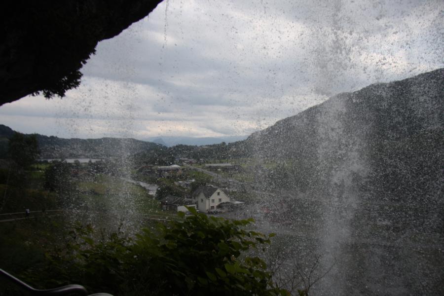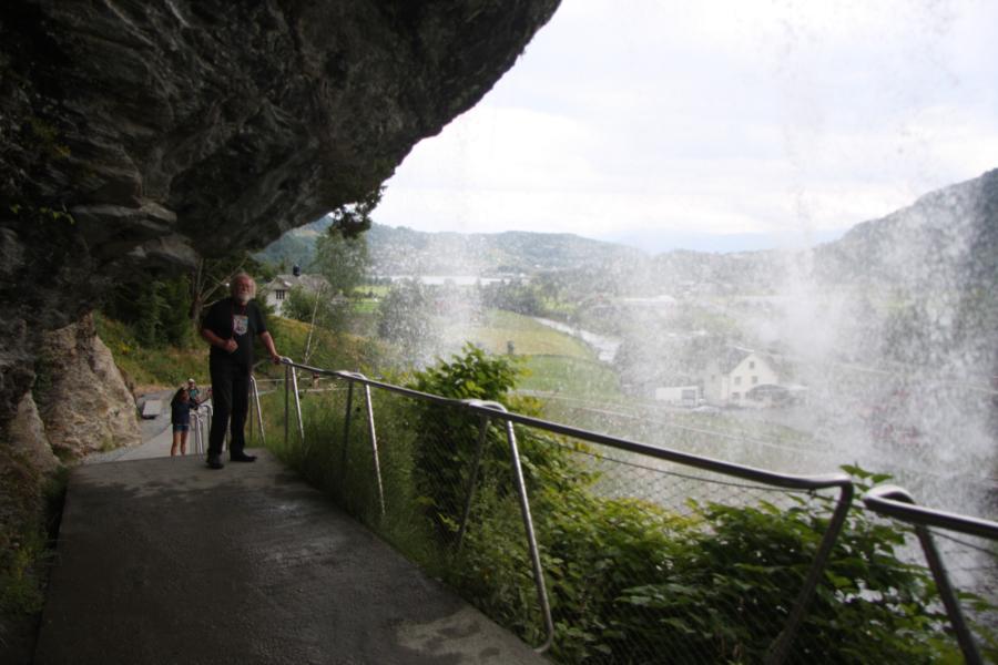 Kurz vor Norheimsund ist ein Wasserfall. Auf der Herfahrt fanden wir ihn zu spärlich um anzuhalten, aber jetzt fahren wir mal hin. Steinsdalsfossen