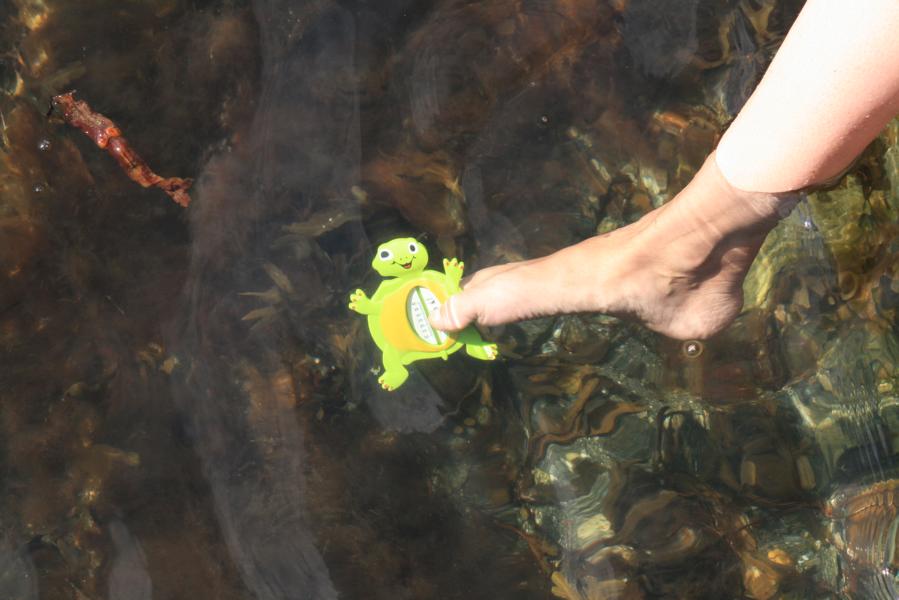 Ich setze mal unser Wasserthermometer in ca. 30 cm Tiefe und es zeigt 20 Grad an
