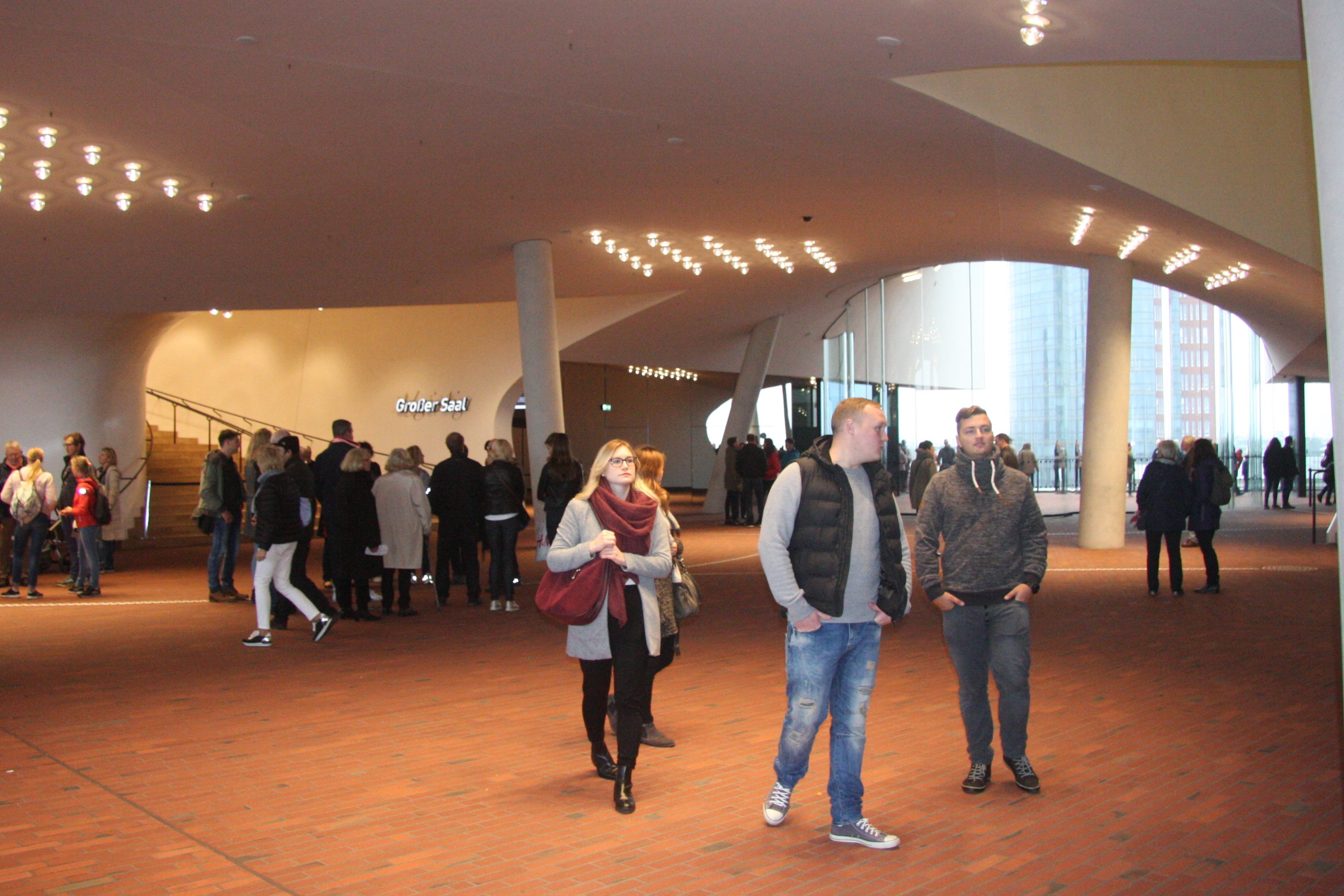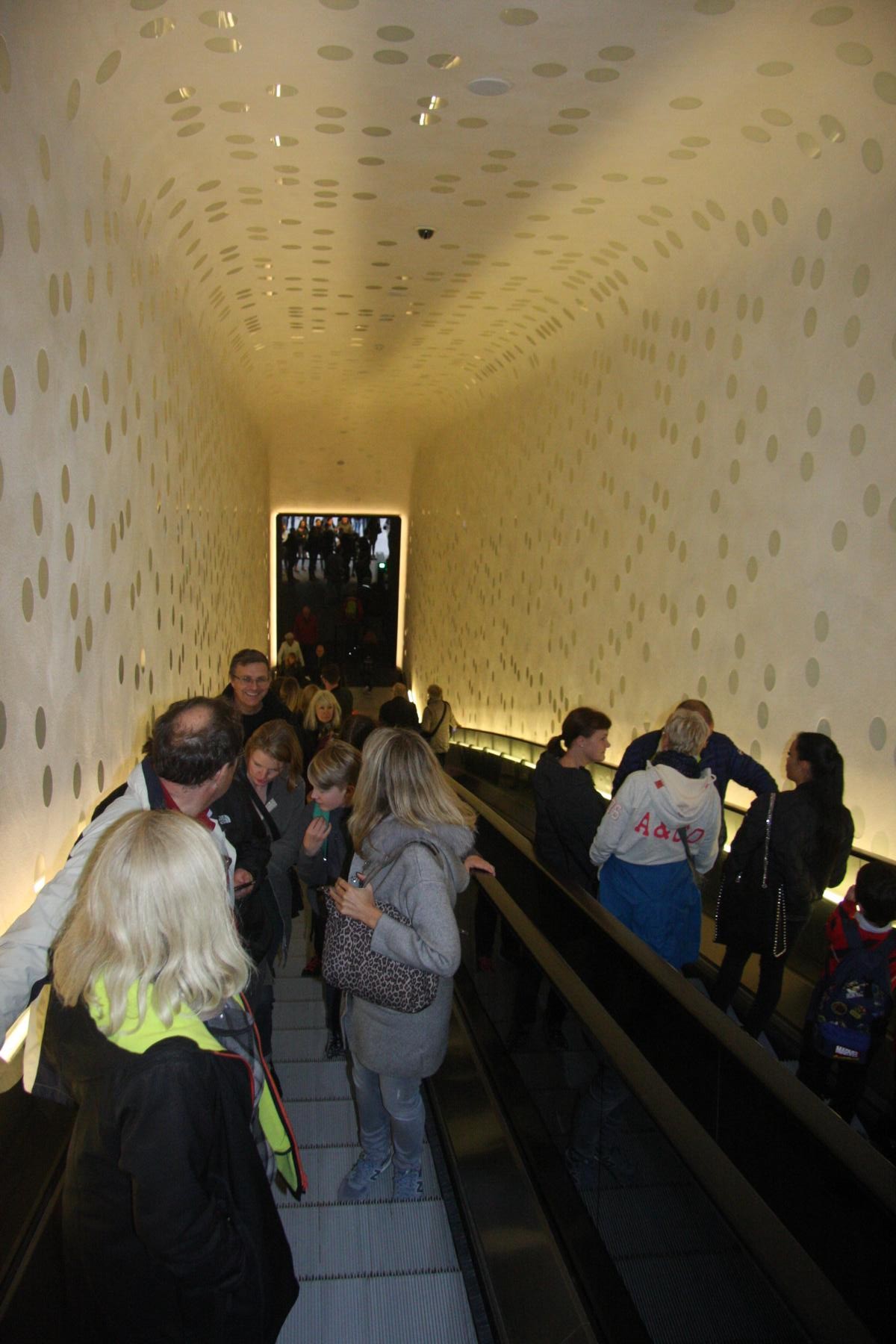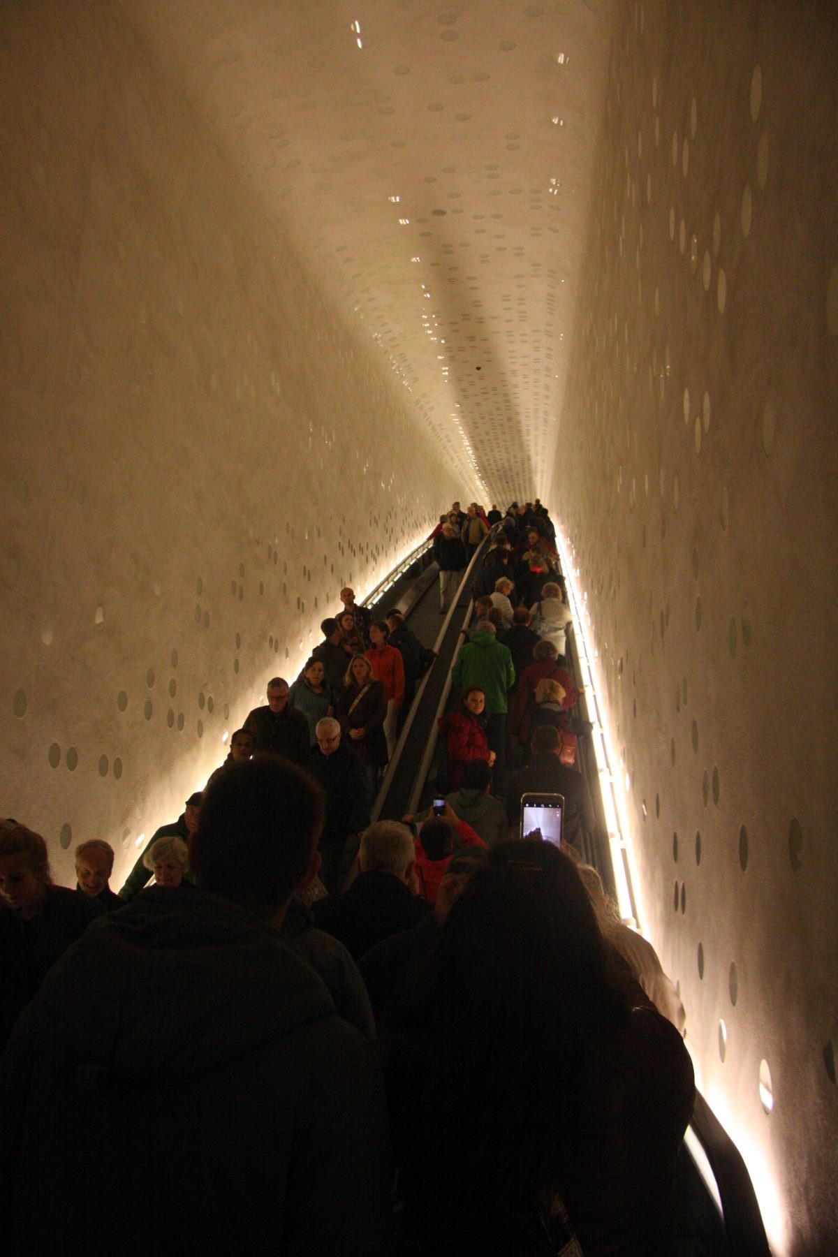 Wichtig ist, dass man, um auf die Plaza zu gelangen, ein Ticket braucht. Dieses ist kostenlos, weist einem aber ein bestimmtes Zeitfenster von einer Stunde zu. Man kann eine Reservierung über das Internet vornehmen https://shop.elbphilharmonie.de/de/plaza-ticket/ oder vor Ort (mit u.U. langen Schlangen und Warterei) an den Schaltern holen. Und dann gibt es noch Ticketautomaten, die so gut versteckt sind, dass man sie eigentlich nicht findet. Hierzu geht man den Gang rechts neben den Schaltern Richtung Parkhaus bis ganz zuende und da steht er dann... Vor lauter Freude, ihn gefunden zu haben, habe ich vergessen ein Foto von ihm zu machen